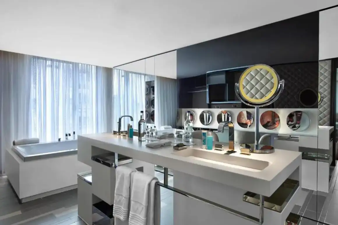 Каждая ванная комната здесь выглядит как персонаж из научно-фантастического фильма. Столешницы из белого мрамора, зеркальные и стеклянные элементы, а также необычное освещение дополняют всю эстетику. Некоторые люксы в этом отеле, где разрешено размещение с домашними животными, даже оборудованы собственной ванной-джакузи.